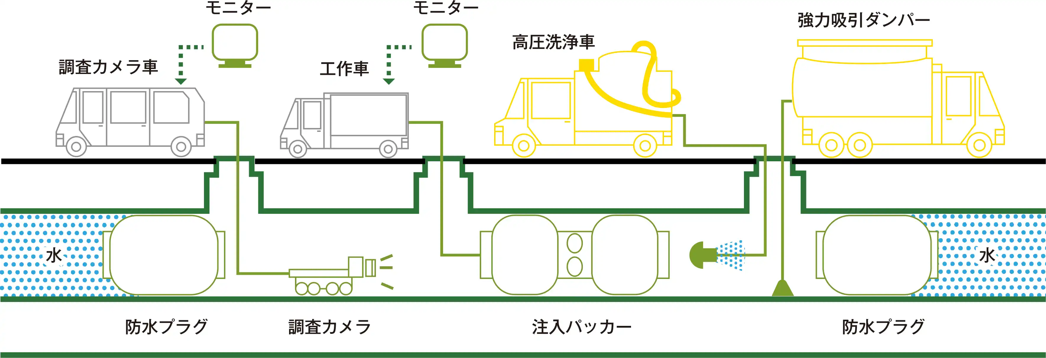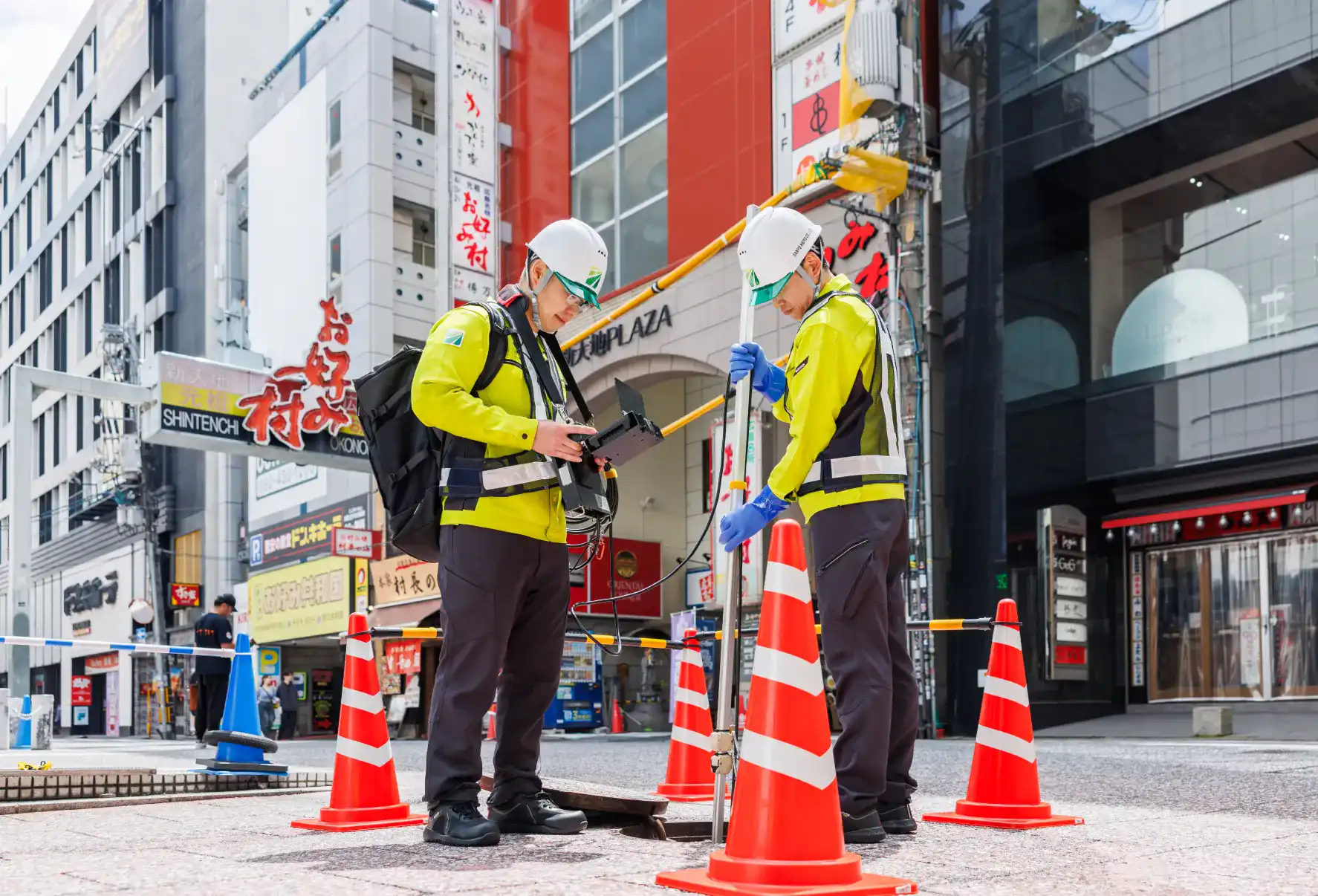 従来のような自走式カメラを使わないため、事前の大掛かりな管内洗浄が不要なケースが多く、準備や撤収も非常にスピーディーです。また、作業員がマンホール内に入らないため、酸欠や転落のリスクがなく、市街地や交通量の多い道路でも安全かつコンパクトに作業を行えます。