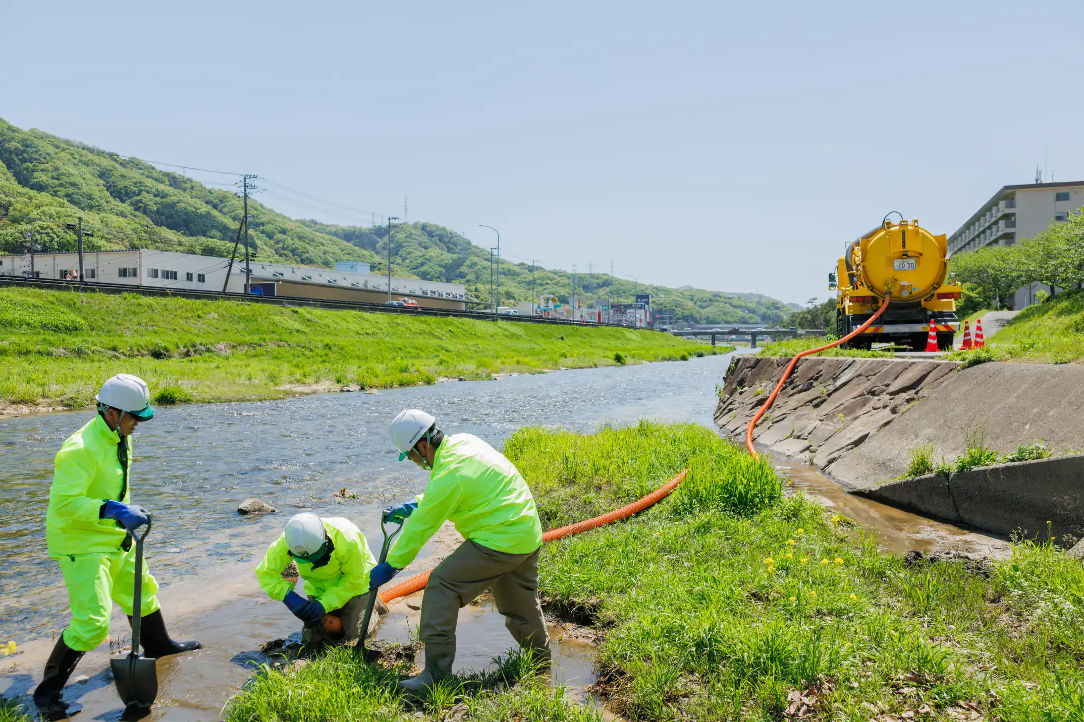 専用の吸引車(バキューム車)や洗浄機を使用し、溜まった堆積物を効率的かつ確実に除去します。